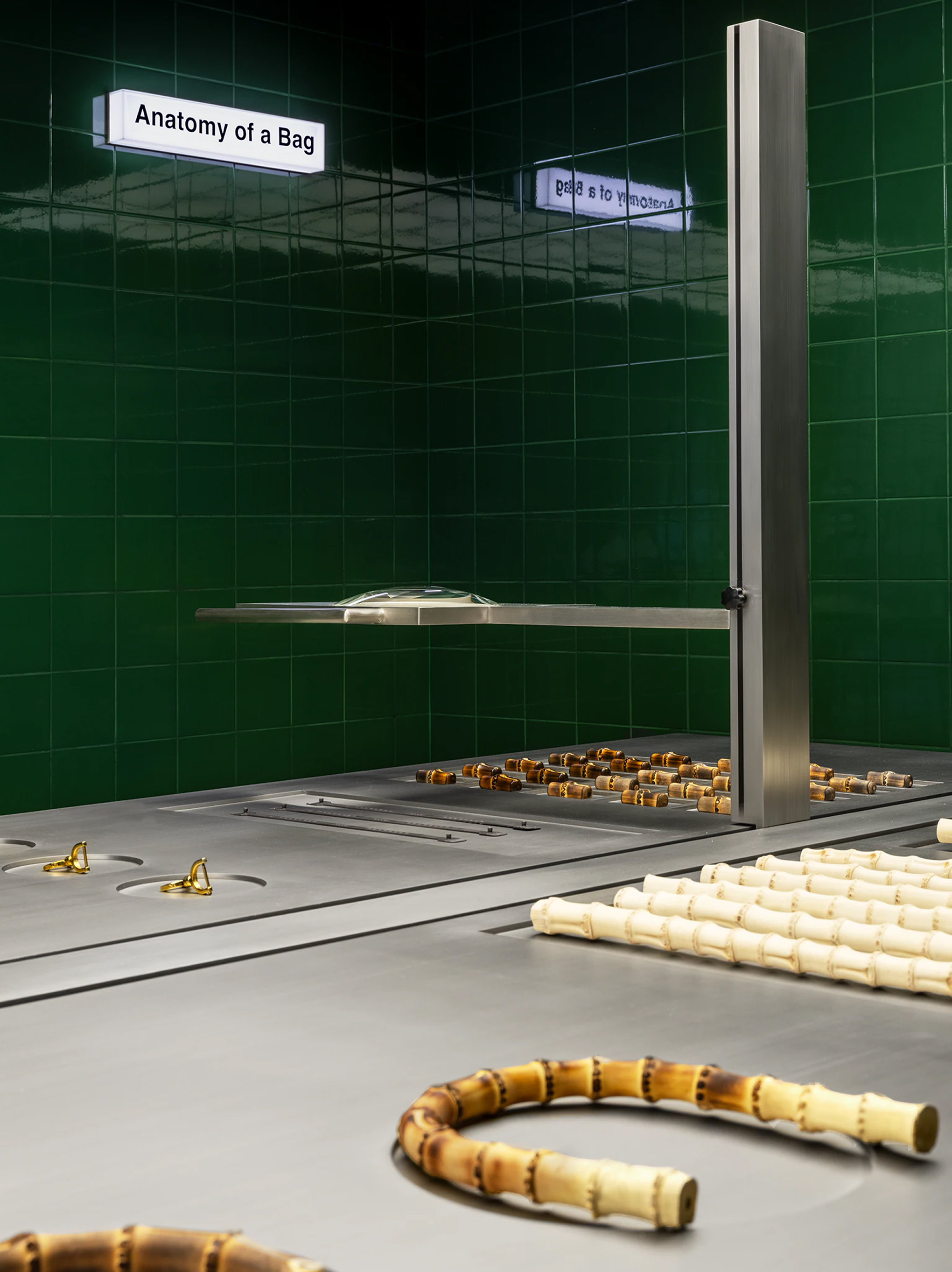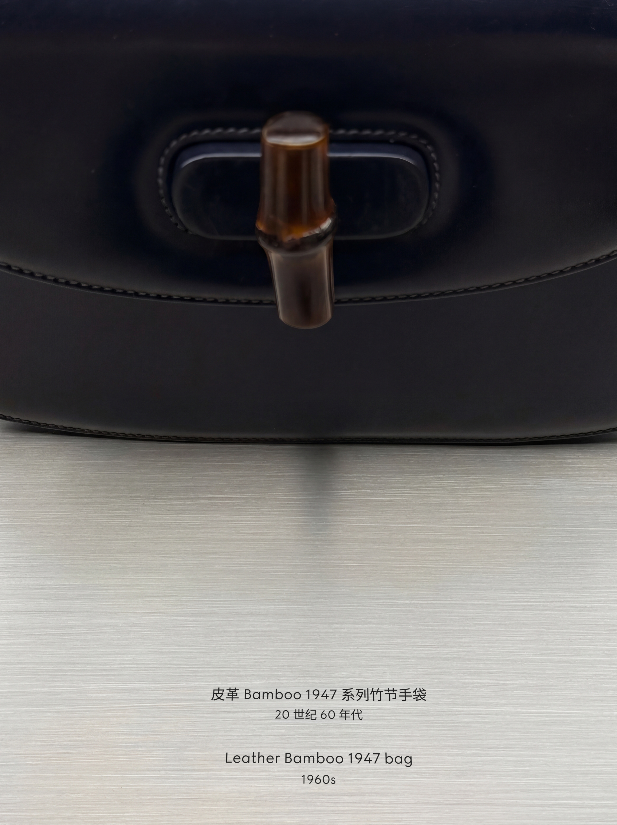 The exhibition traces the origins of the Gucci Bamboo 1947 bag, from its equestrian-inspired craftsmanship to its signature curved bamboo handle.